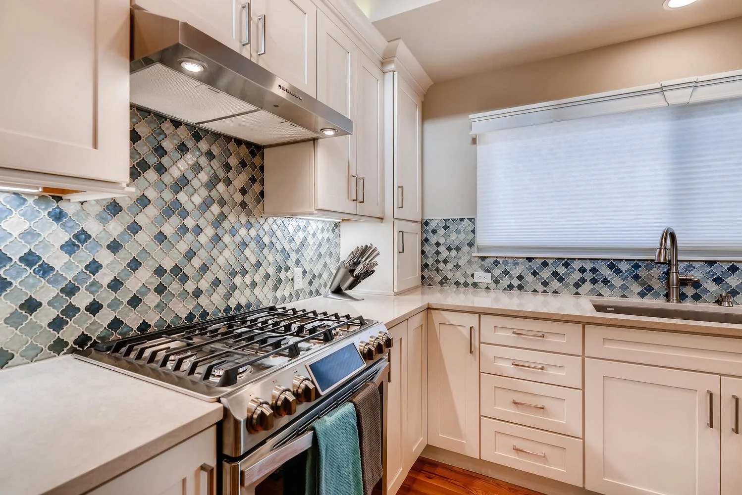 In an effort to highlight the large window above the kitchen sink and amazing beams on the ceiling (which open up to a play area loft above), we reconfigured it all. This small family of four loves to entertain and dine with other families, but were lacking dining spaces for hosting such events. We created a dine-in kitchen nook for everyday eating and for child seating complete with benches. A large island makes serving food and chatting with dinner guests convenient and comfortable, as well as open to the adult dining space.