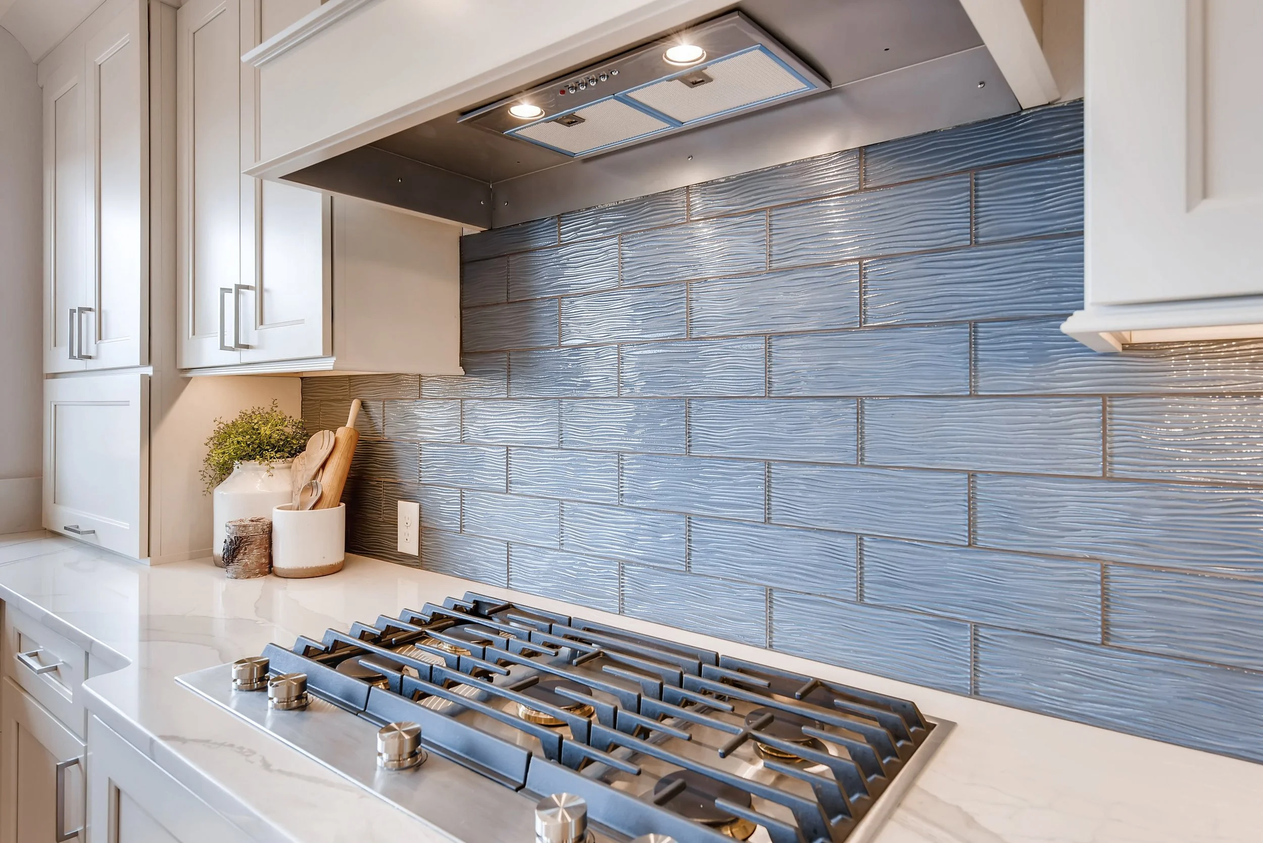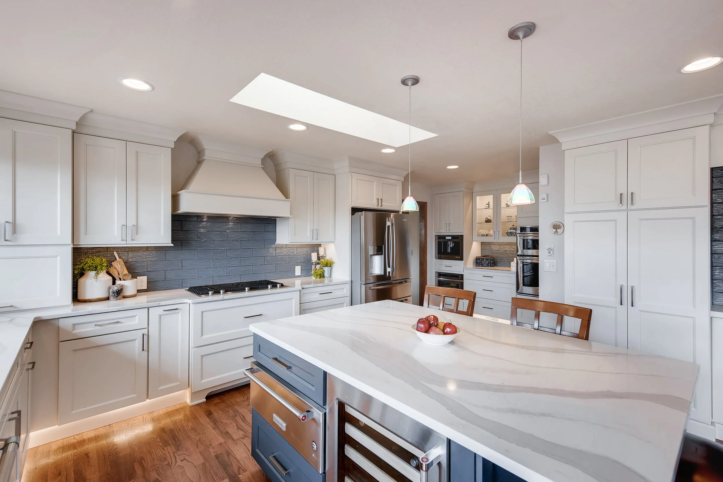 In this design, both husband and wife had a unique design needs. He wanted to create a space that would house all the high-end appliances and kitchen gadgets. She desired a comfy place where people could sit and talk while making food. Both of their needs came together in this beautiful kitchen. There is plenty of seating along the island and the marbling in the countertops is gorgeous. The backsplash has a rippling effect which is a great contrast to the countertops and the wood hood vent is the centerpiece for the whole kitchen. The perfect end to this project was enjoying the space with the couple. This is the best place in town to get a cappuccino…so delicious!