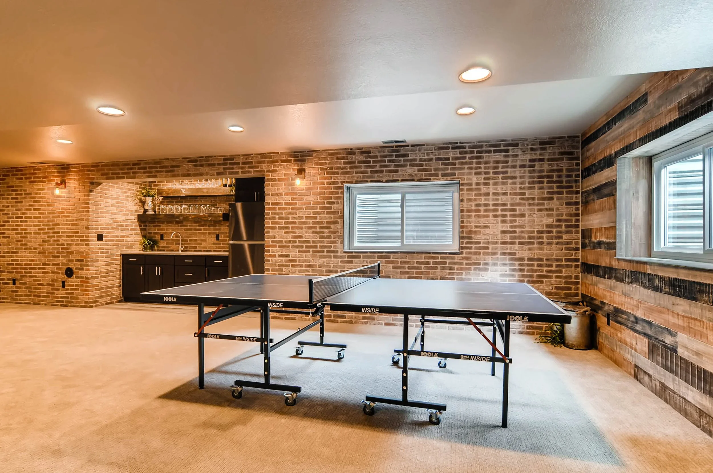 This project was such an amazing opportunity to pull in some of our most loved features: rustic brick and reclaimed wood shelving! This industrial pub-themed basement turned out to be a posh place for this family to entertain and relax.